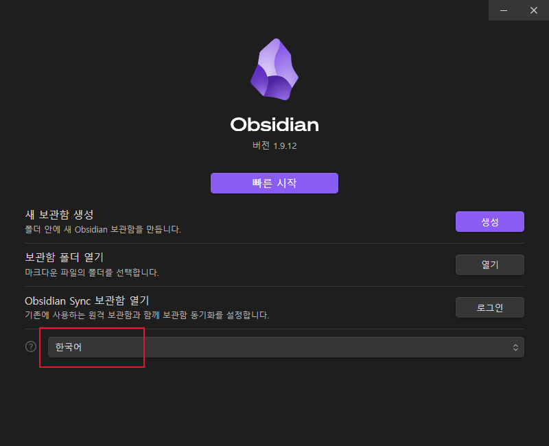 - 보라색 빠른 시작 버튼을 누르면 옵시디언의 기본 사용법과 샘플 보관함을 바로 열 수 있어요.