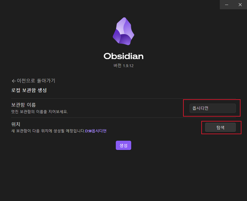 탐색 버튼을 눌러 원하는 위치(예: 문서/ObsidianVaults 폴더)를 선택하면 돼요.